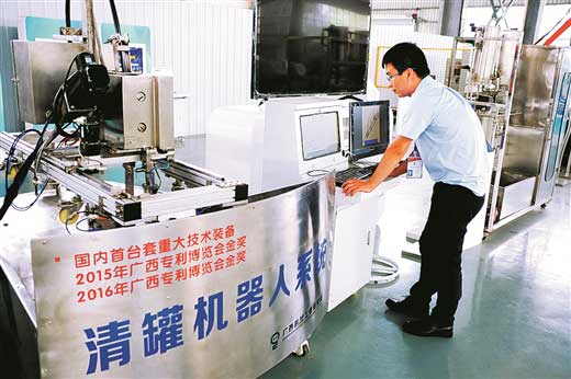 打造首臺(tái)套高壓清洗機(jī)器人。2014年底,高壓清洗機(jī)器人系統(tǒng)在廣西上上糖業(yè)有限公司正式投入榨季運(yùn)行,標(biāo)志著高壓清洗機(jī)器人系統(tǒng)研發(fā)成果順利實(shí)現(xiàn)產(chǎn)業(yè)化推廣。該系統(tǒng)是完全自主研發(fā),共獲21項(xiàng)專(zhuān)利(其中發(fā)明專(zhuān)利5項(xiàng)),獲廣西專(zhuān)利博覽會(huì)金獎(jiǎng)專(zhuān)利2項(xiàng),并于2015年獲得自治區(qū)工信委國(guó)內(nèi)首臺(tái)(套)重大技術(shù)裝備認(rèn)定,2018年獲得廣西創(chuàng)新發(fā)展驅(qū)動(dòng)(重大)專(zhuān)項(xiàng)支持。高壓清洗機(jī)器人系統(tǒng)是面向國(guó)內(nèi)外制糖、輕工、食品、化工、制藥等行業(yè),在狹小受限空間、高溫潮濕環(huán)境下,代替人工清洗加熱管機(jī)構(gòu)的機(jī)器人,屬世界首創(chuàng),達(dá)到代替?zhèn)鹘y(tǒng)人工作業(yè)方式、減少人員傷亡、提高安全生產(chǎn)率和提升清洗質(zhì)量的效果。目前,該系統(tǒng)已在廣西、云南、新疆等主要制糖產(chǎn)區(qū)企業(yè)大量應(yīng)用,并出口泰國(guó)、越南、緬甸等國(guó)家,受到海外客戶高度認(rèn)可,打造了廣西制糖智能裝備的優(yōu)質(zhì)品牌。
