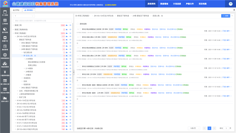 系統(tǒng)設(shè)置了管理性文件上傳、質(zhì)保資料填報(bào)與簽批、聲像文件采集等模塊,具有較強(qiáng)的實(shí)用性。一是關(guān)聯(lián)度高,檔案管理系統(tǒng)可與各業(yè)務(wù)系統(tǒng)(計(jì)量、征拆、試驗(yàn)等系統(tǒng))實(shí)現(xiàn)集成溯源,接收數(shù)據(jù)文件,最終匯總形成案卷總目錄進(jìn)行檔案封裝。二是可實(shí)現(xiàn)資料的快速簽批,參建單位質(zhì)保資料全部實(shí)現(xiàn)電子簽章線上簽批,有效提高審批效率。三是質(zhì)保資料與現(xiàn)場(chǎng)施工進(jìn)度相同步,其中標(biāo)段質(zhì)保資料模塊、總監(jiān)辦抽檢資料模塊是用戶使用頻次最多的核心模塊,按照用戶反饋不斷加深優(yōu)化,通過(guò)wbs(單位分部分項(xiàng))智能參數(shù)化劃分功能,項(xiàng)目資料填報(bào)從手動(dòng)新增,變成系統(tǒng)自動(dòng)批量生成,效率提升75%以上。除資料填報(bào)效率高的同時(shí),目前系統(tǒng)采用法律認(rèn)可的電子簽章技術(shù),通過(guò)標(biāo)準(zhǔn)化數(shù)據(jù)接口,對(duì)oa、征拆、計(jì)量、質(zhì)量等多個(gè)系統(tǒng)數(shù)據(jù)實(shí)現(xiàn)一鍵歸檔,效率提升60%以上,極大提高了的工作效率,有效降低了參建單位的人力成本、時(shí)間成本、管理成本。四是系統(tǒng)已實(shí)現(xiàn)一鍵評(píng)定、自動(dòng)預(yù)組卷、線上案卷封裝等功能;五是實(shí)現(xiàn)公路建設(shè)項(xiàng)目電子檔案驗(yàn)收管理系統(tǒng)的應(yīng)用;六是運(yùn)維團(tuán)隊(duì)能夠及時(shí)響應(yīng),由公路、檔案、信息化組成的專業(yè)項(xiàng)目團(tuán)隊(duì)線上全年度24小時(shí)維護(hù),線下按階段定期上門跟蹤回訪。