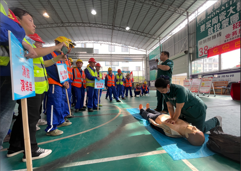醫(yī)護(hù)人員現(xiàn)場(chǎng)示范中暑急救、胸外擠壓急救措施、人工呼吸方法、骨傷綁扎固定等應(yīng)急救援措施