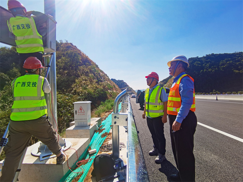 今年是平果至南寧高速公路項目建成通車之年,目前已全面進入沖刺通車階段。在機電項目現(xiàn)場,工人們頂著烈日搶工期、奪進度,忙著安裝燈具、敷設電纜、調(diào)試攝像機,一派繁忙緊張的施工景象。王吉才董事長驅(qū)車一路檢查,先后深入鑼圩收費站、下邊隧道、金陵收費站、石埠收費站收費等重要施工點,看望慰問一線工人,實地察看施工進展情況。